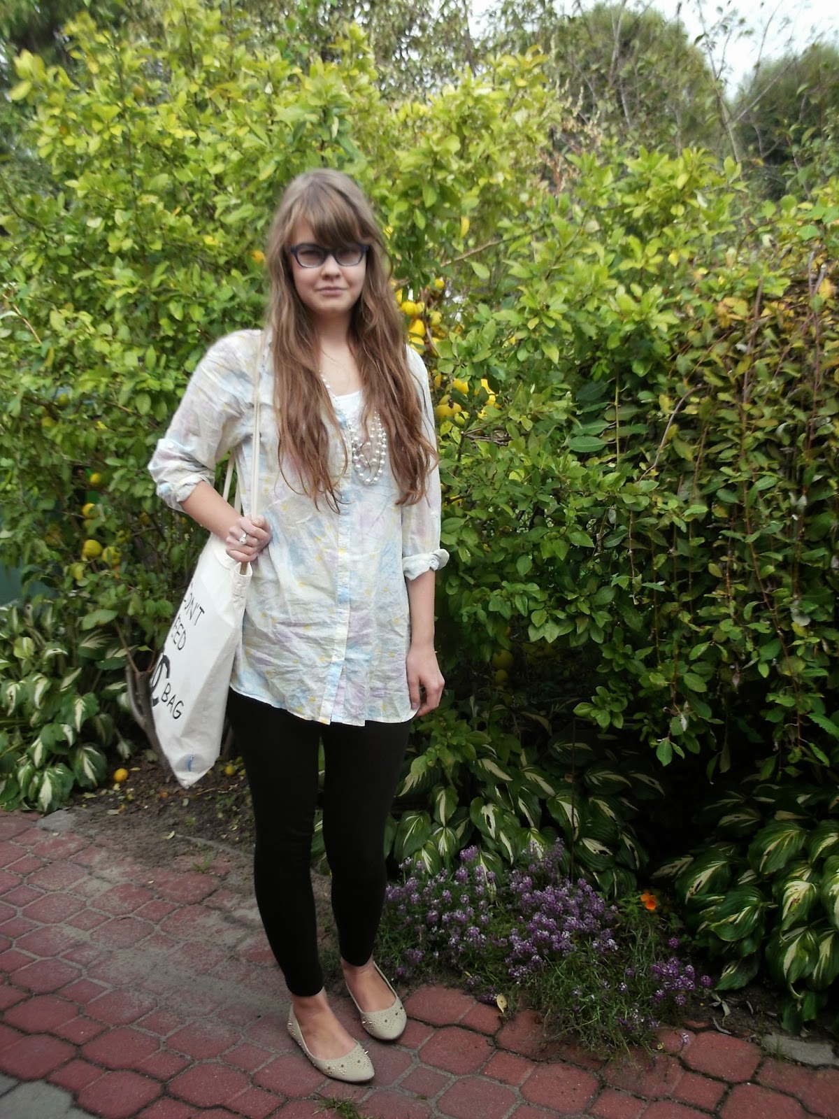 Pastelową koszulę w kwiaty zestawiłam z wygodnymi legginsami w kolorze czarnym. Do tego bardziej eleganckie dodatki-perły, pierścionek ze srebra i baleriny w kolorze szampana. Na koniec wzięłam lnianą torebkę ze śmiesznym napisem i byłam gotowa.